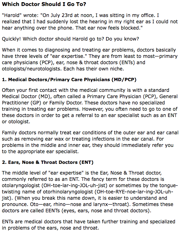 You may need a Doctor Consult the ear To a certain Reasons name, if you experience loss of hearing , dizziness, ear pain, And Sometimes ear infections. ACCORDING June recent survey, problems of hearing of the ARE in June of the more common medical conditions they nowadays Americans suffer hearing doctor hearing aid doctor. Indeed, it is that you do not neglect Imperative ear Nor persistent problem. Consult a Doctor of the ear and more Early check that you diligently follow that suggested treatment plan hearing doctor.